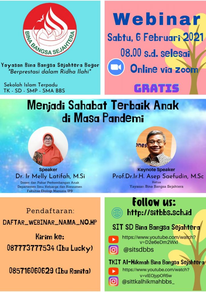 Dilatarbelakangi hal tersebut maka Yayasan Bina Bangsa Sejahtera melalui unit SDIT dan TKIT BBS pada Sabtu, 6 Februari 2021 melaksanakan kegiatan WEBINAR yang mengusung tema “MENJADI SAHABAT TERBAIK ANAK DI MASA PANDEMI”. Dalam kegiatan tersebut dibuka langsung oleh Ketua Yayasan Bina Bangsa Sejahtera Prof. Dr. Ir. H. Asep Saefudin, M.Sc. serta menghadirkan Pakar Perkembangan Anak IPB Dr. Ir. Melly Latifah, M.Si.