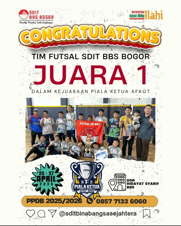 Alhamdulillah. Barakallah tim futsal SDIT BBS telah menjuarai Kejuaraan Piala AFKOT, 25-27 April 2025 di GOR Hidayat Syarif BBS.